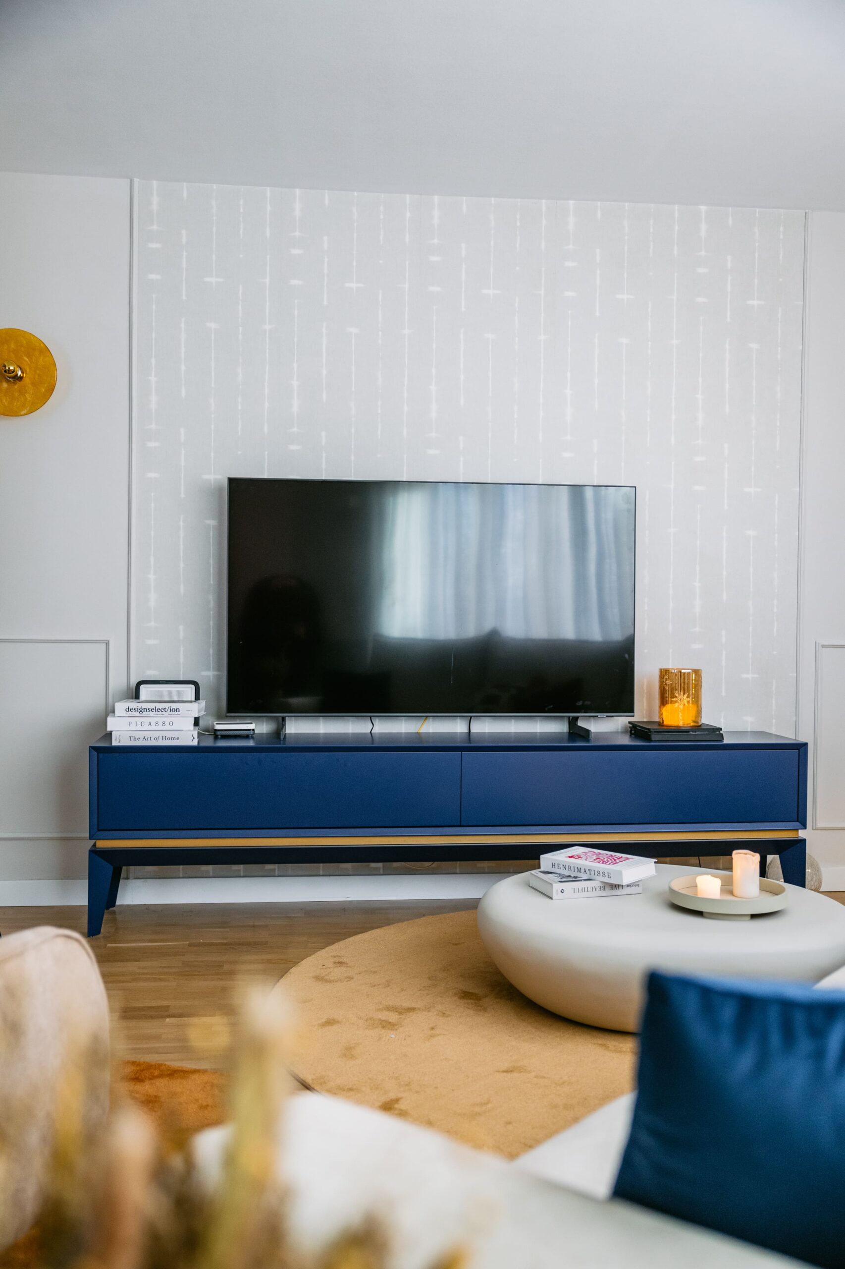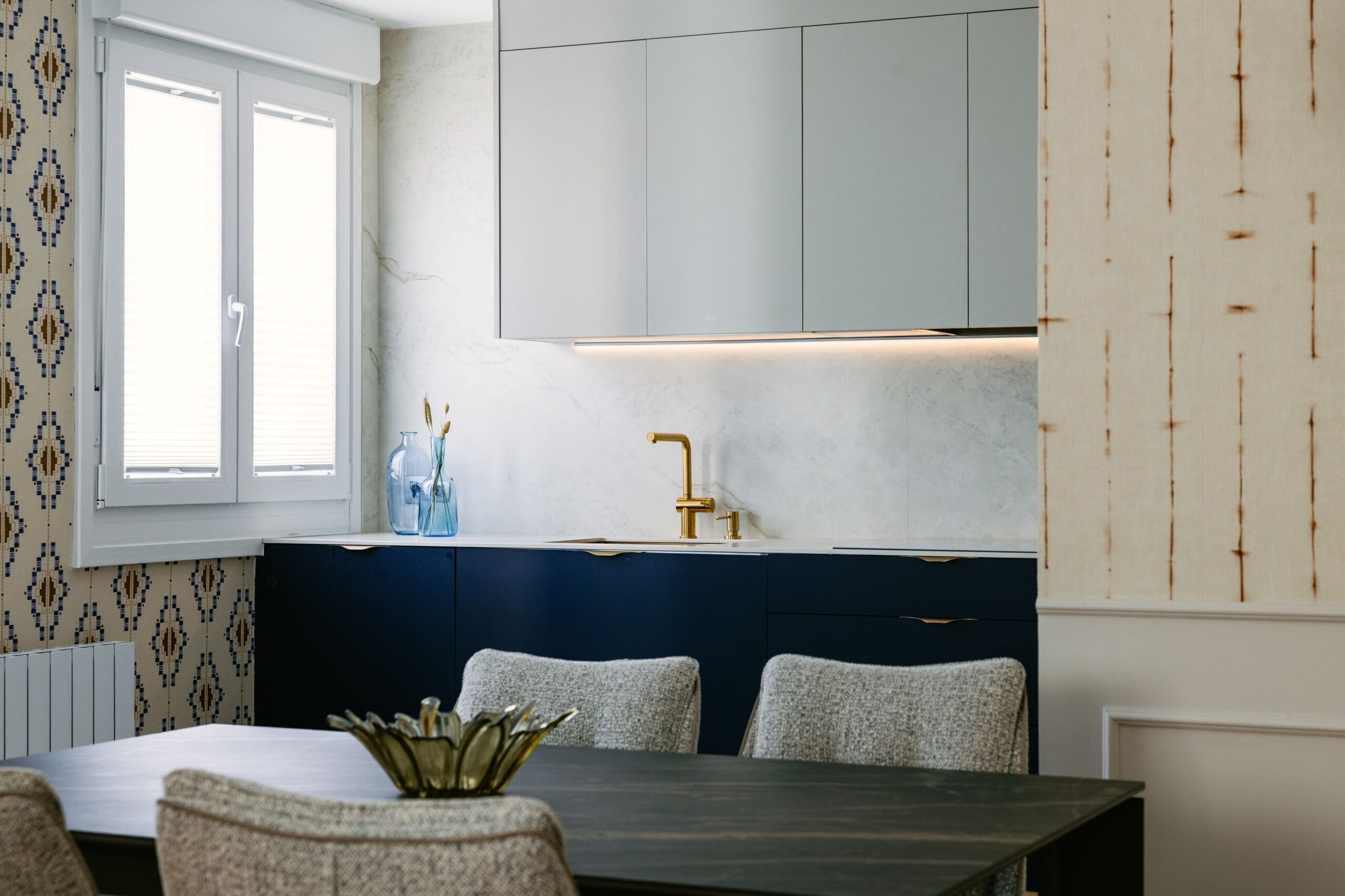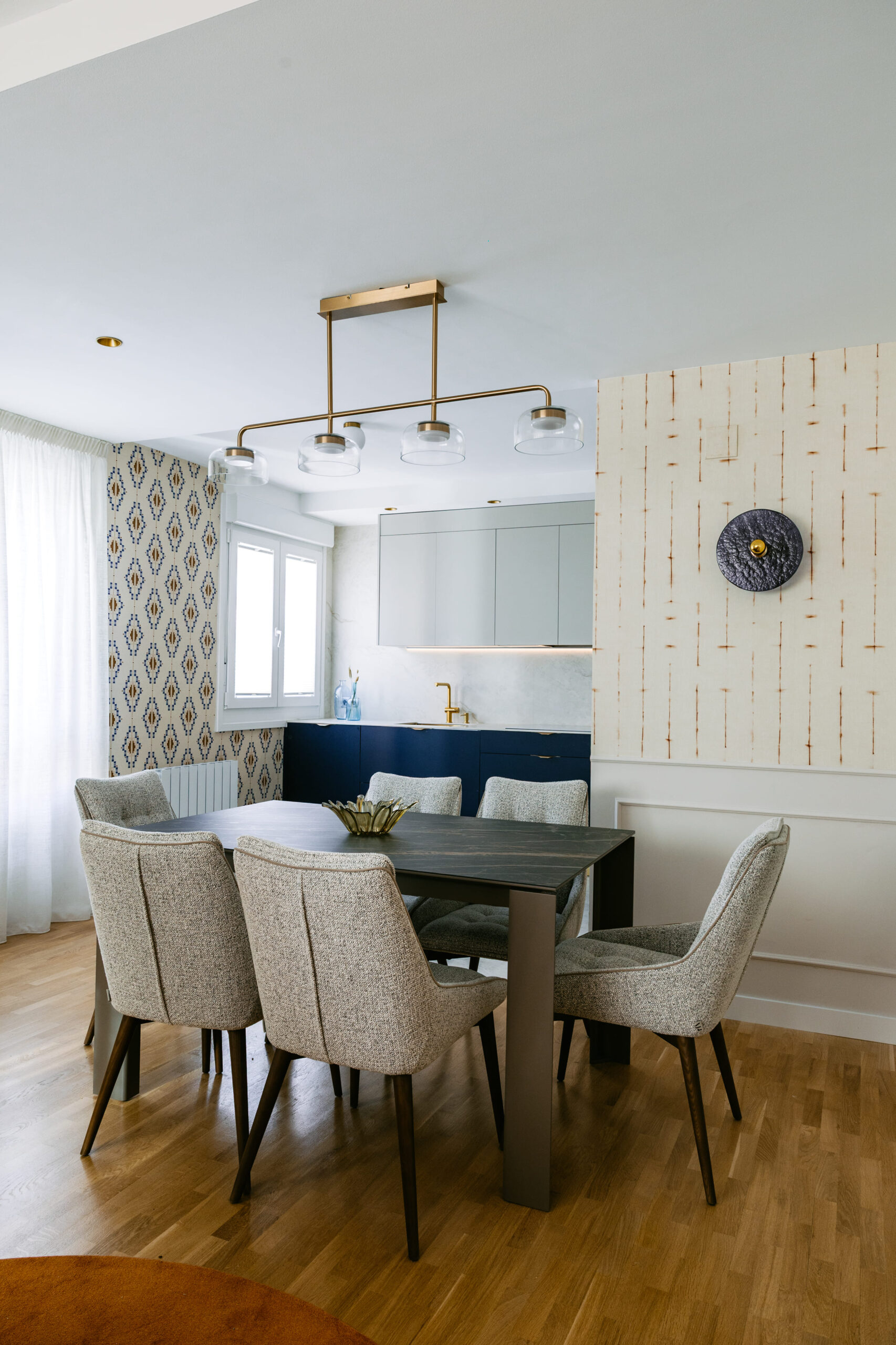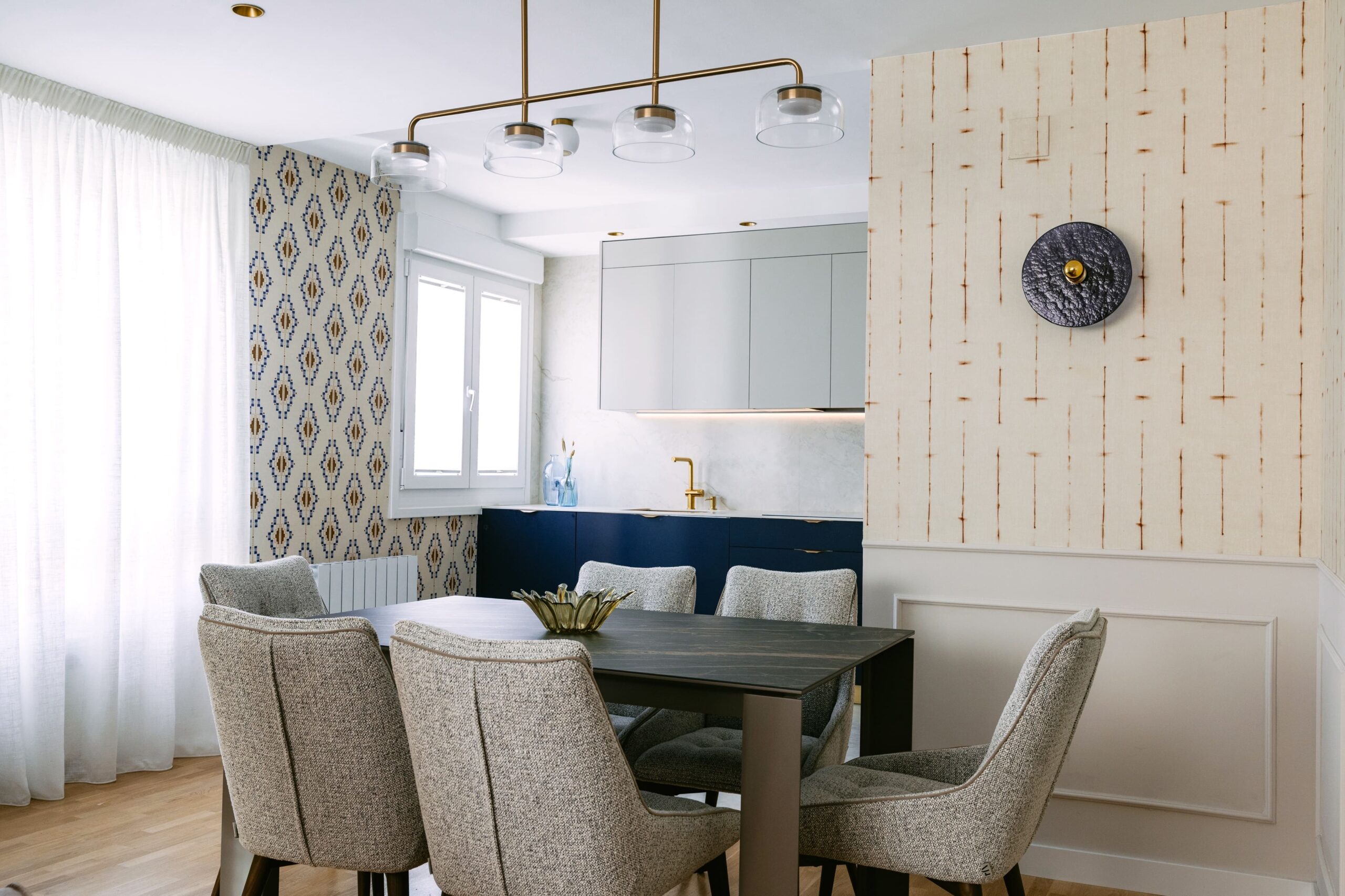La paleta de tonos claros combinados con azules profundos aporta equilibrio, mientras que el papel pintado decorativo introduce carácter y personalidad sin renunciar a la calma. La iluminación interior cuidada envuelve el espacio, realza los materiales y crea una atmósfera cálida y acogedora.