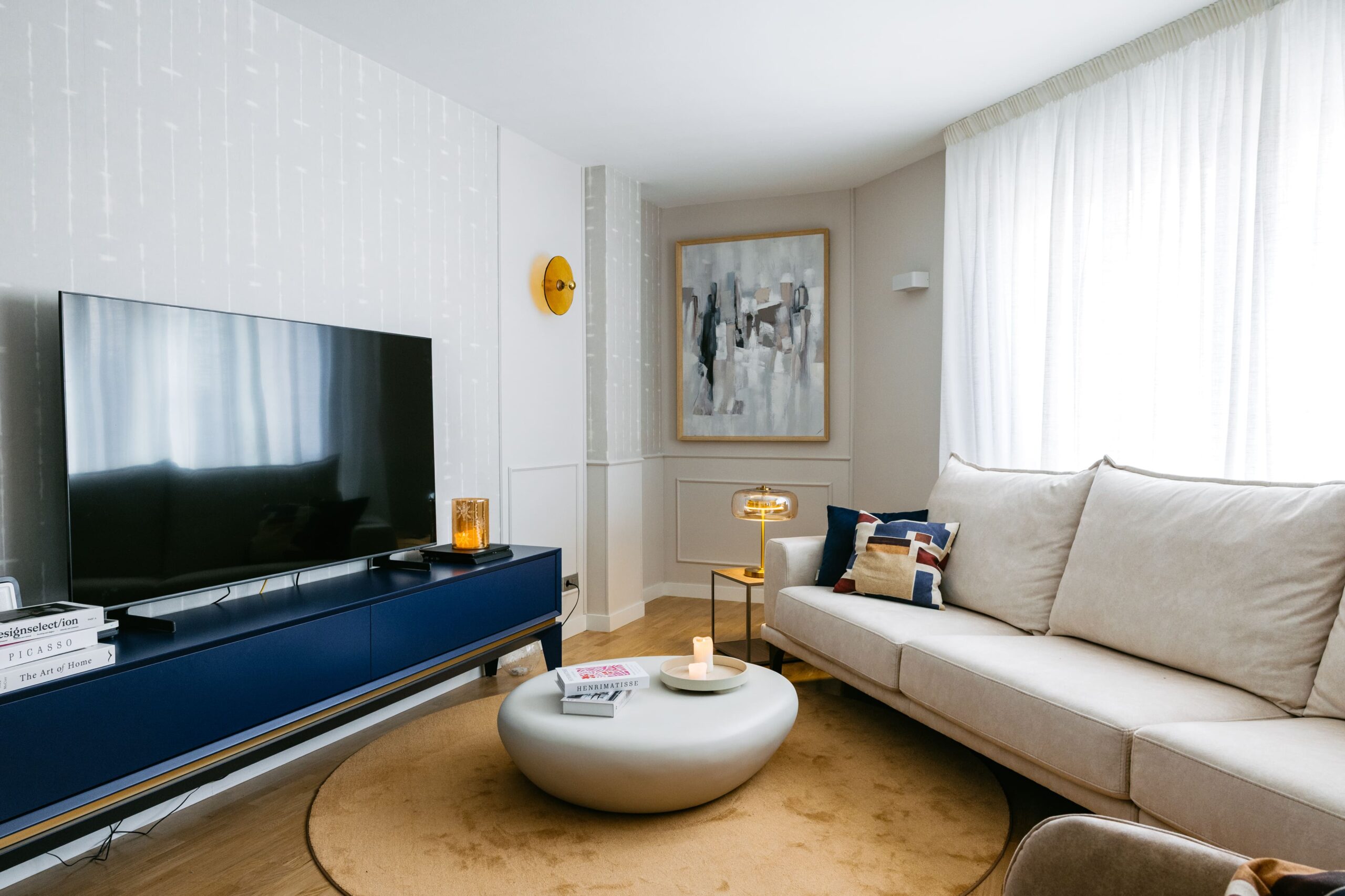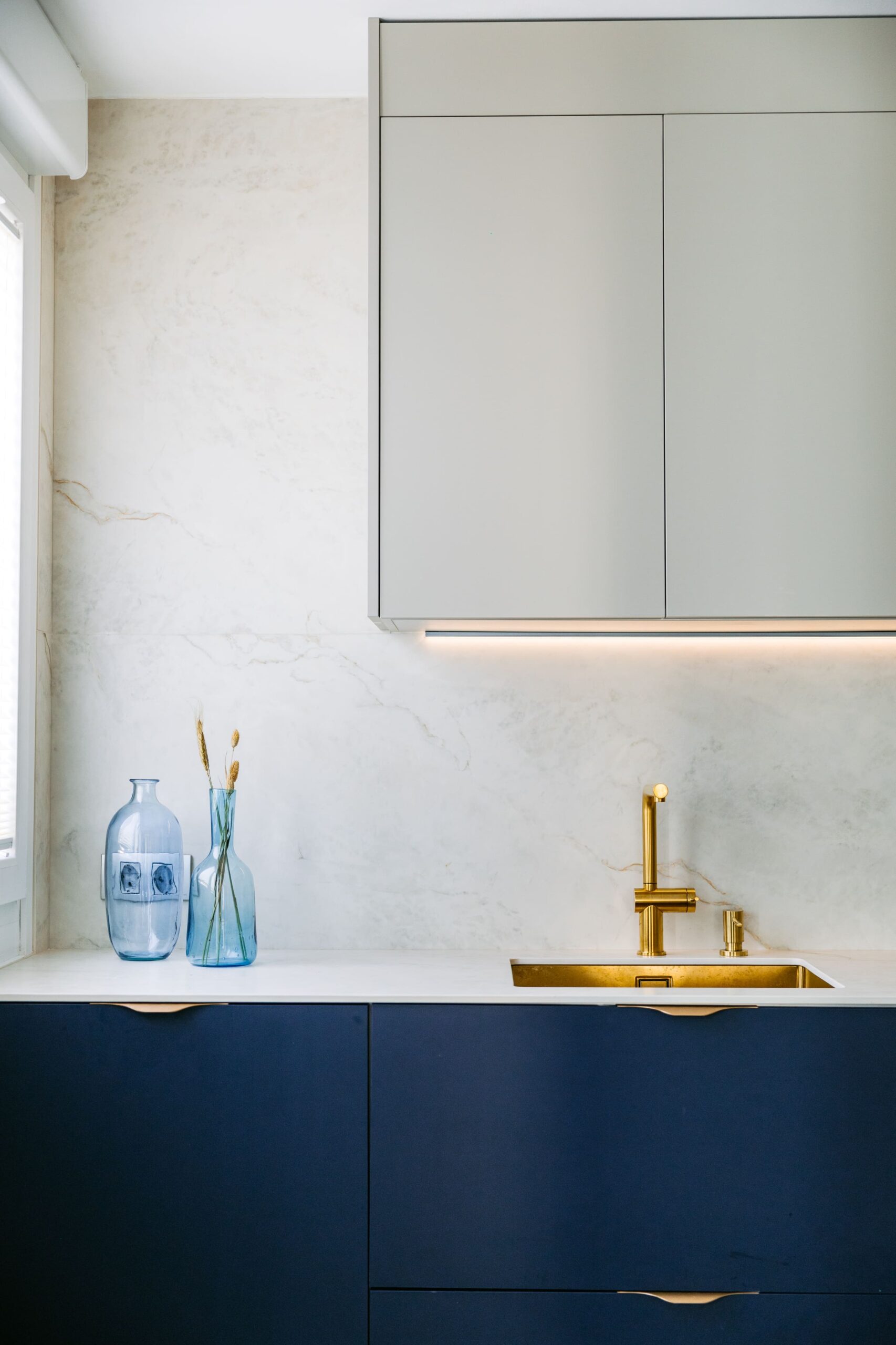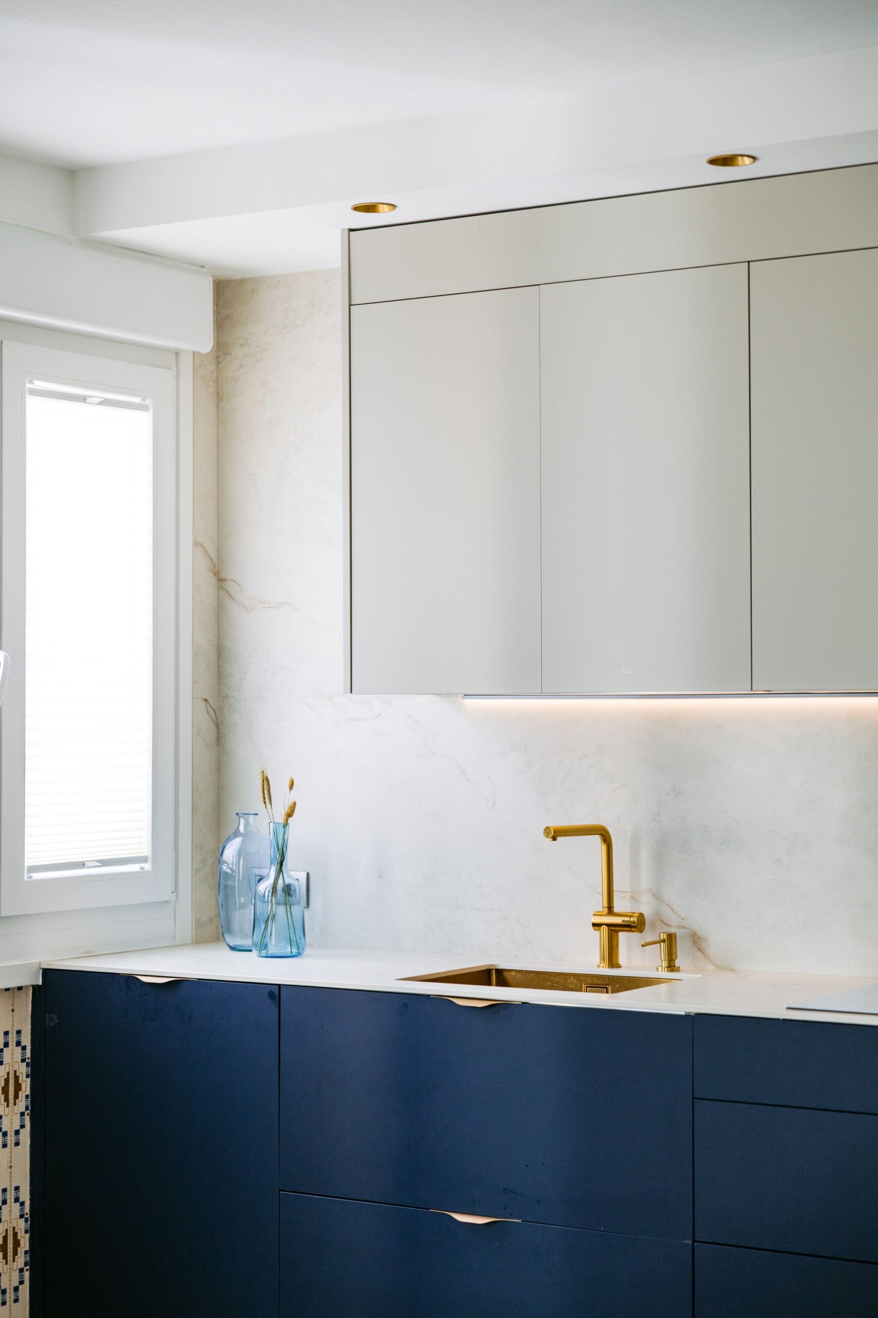 La paleta de tonos claros combinados con azules profundos aporta equilibrio, mientras que el papel pintado decorativo introduce carácter y personalidad sin renunciar a la calma. La iluminación interior cuidada envuelve el espacio, realza los materiales y crea una atmósfera cálida y acogedora.