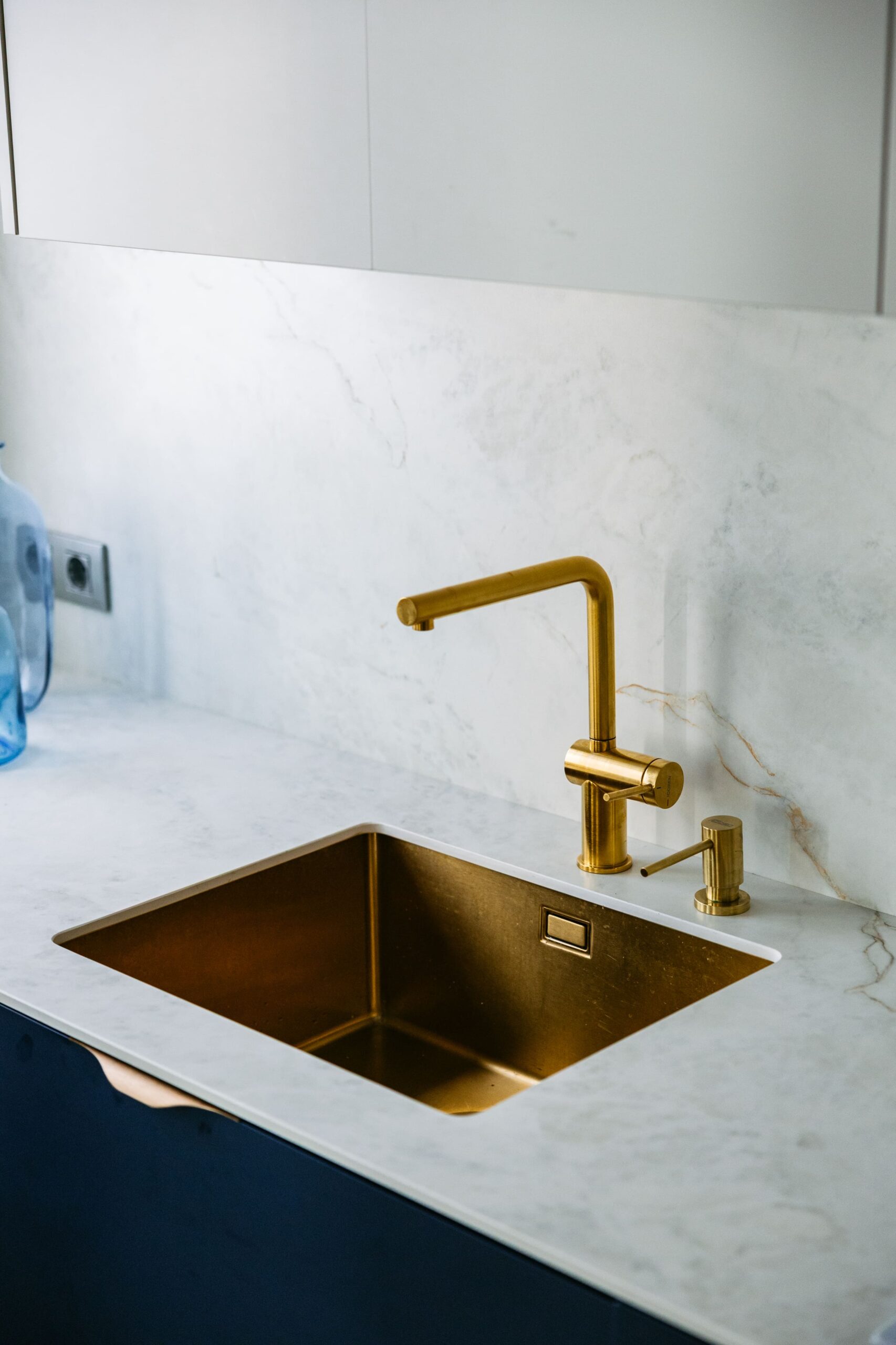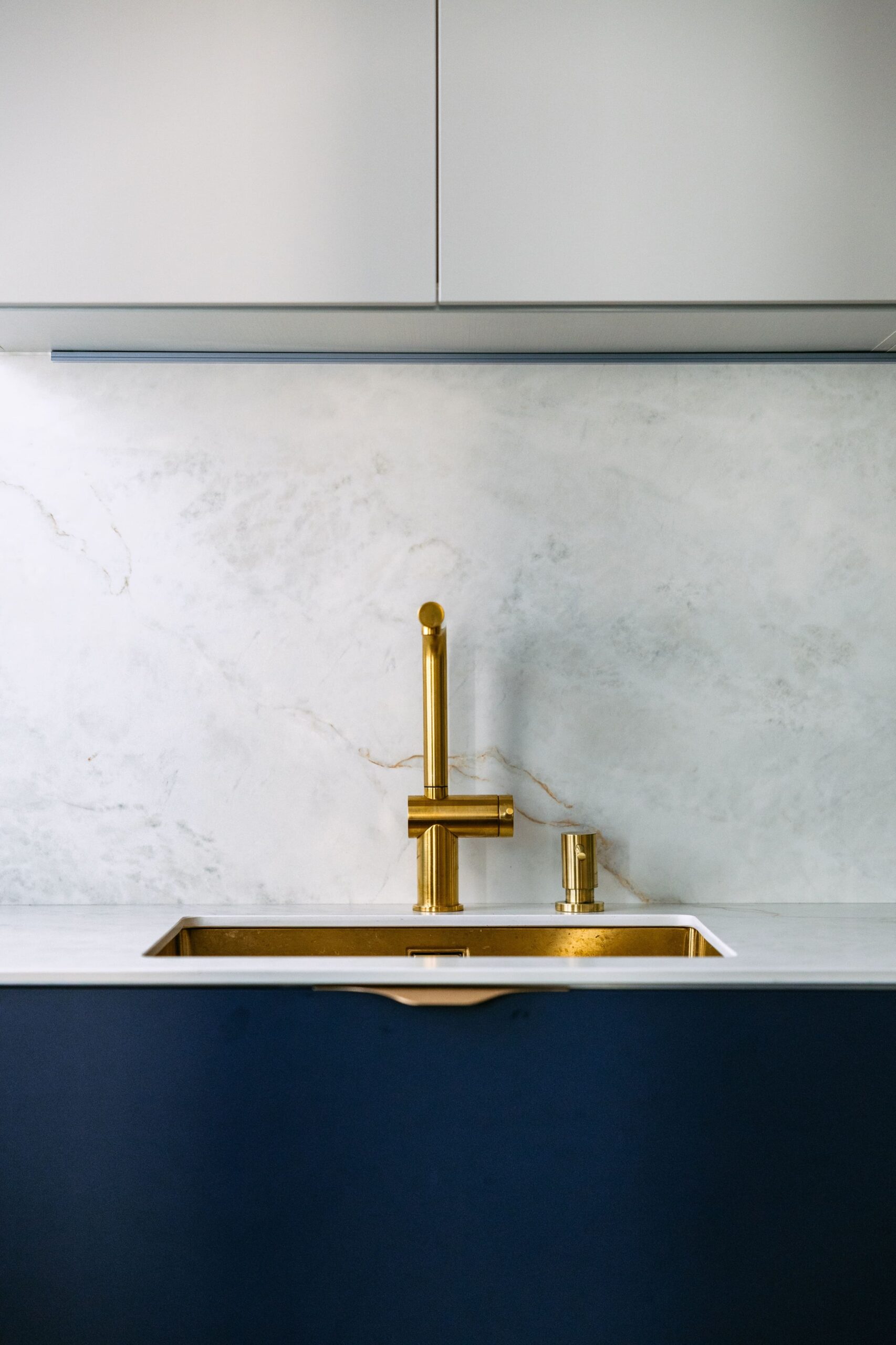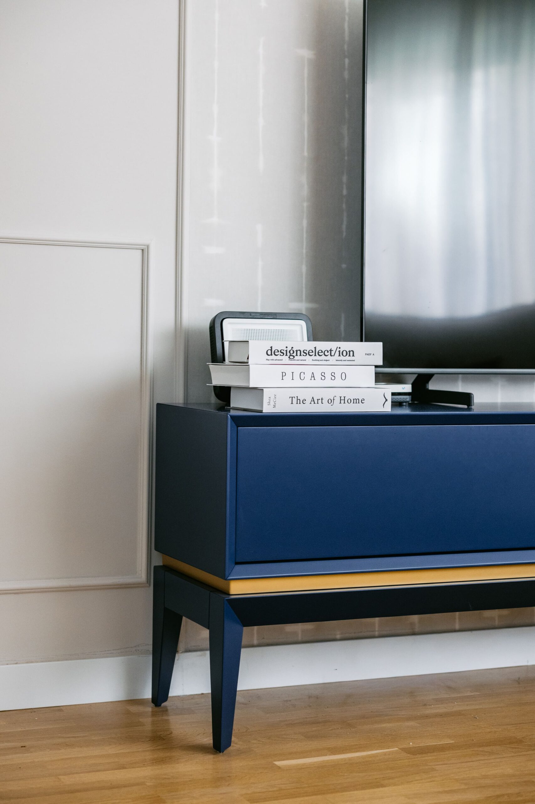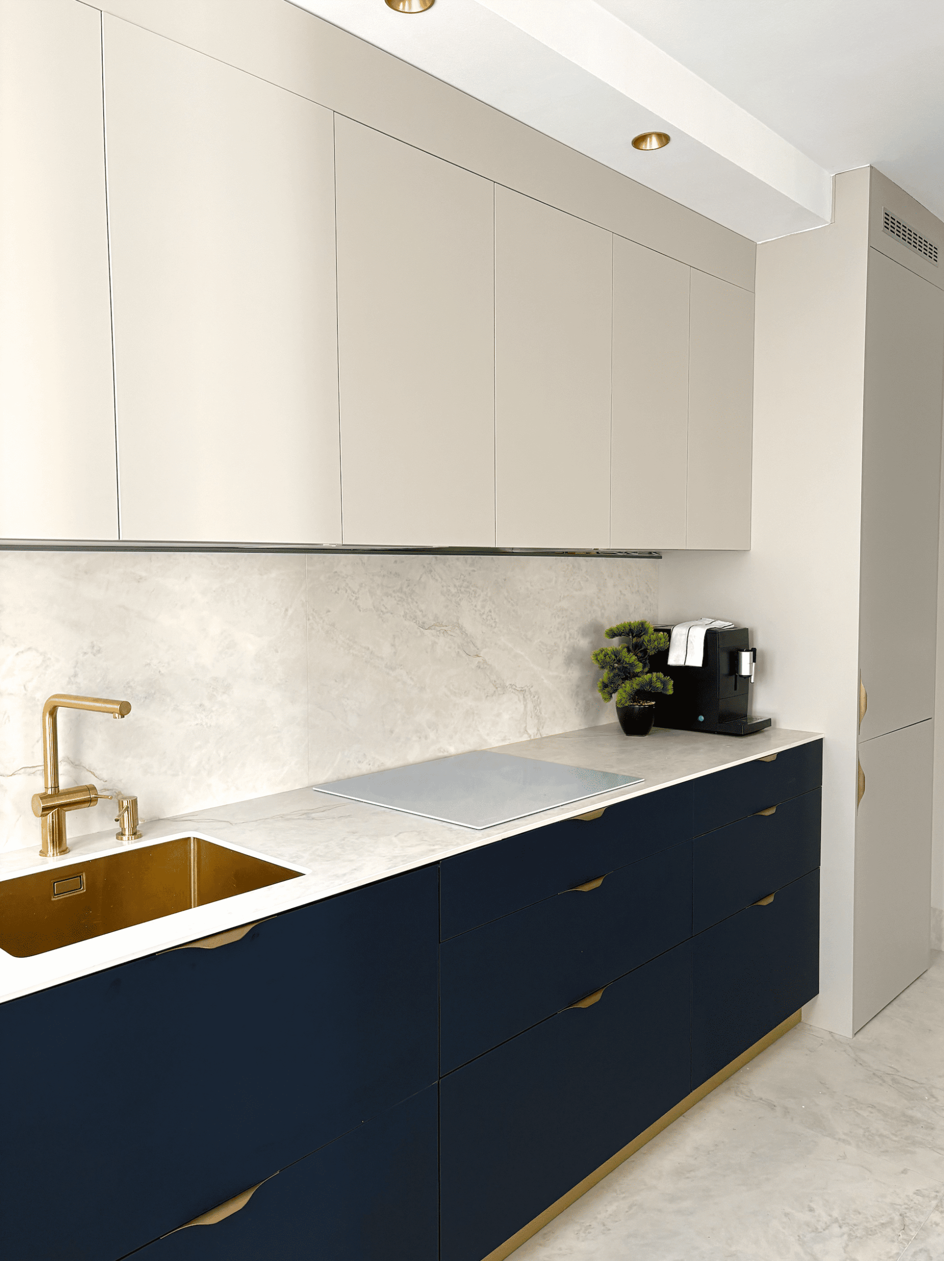 La paleta de tonos claros combinados con azules profundos aporta equilibrio, mientras que el papel pintado decorativo introduce carácter y personalidad sin renunciar a la calma. La iluminación interior cuidada envuelve el espacio, realza los materiales y crea una atmósfera cálida y acogedora.